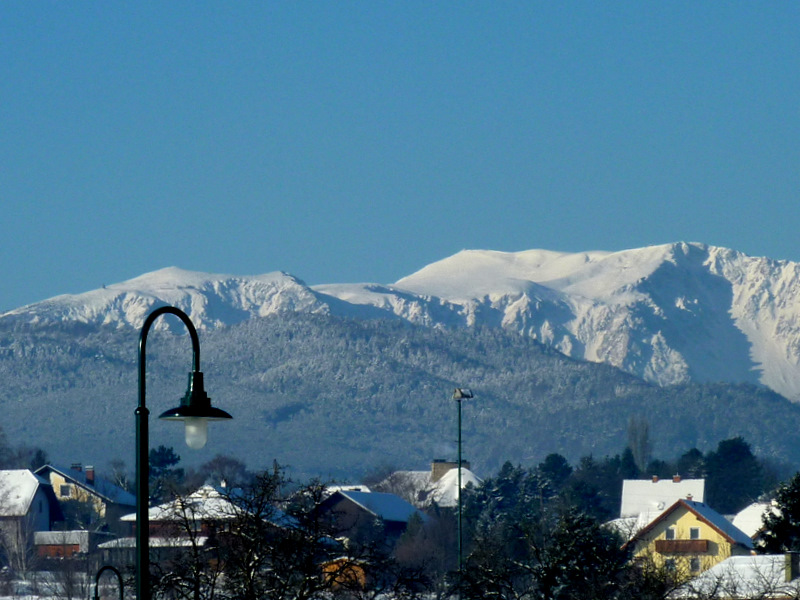 Zoomt man ihn heran, könnte man ihn für den Hausberg von St. Egyden halten; zu sehen sind (v.l.n.r.):