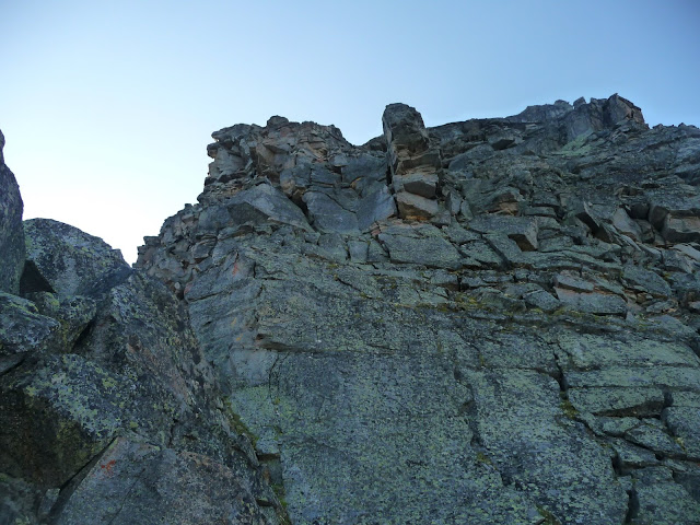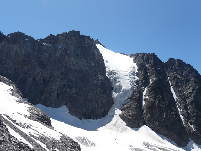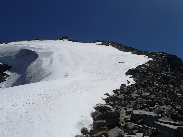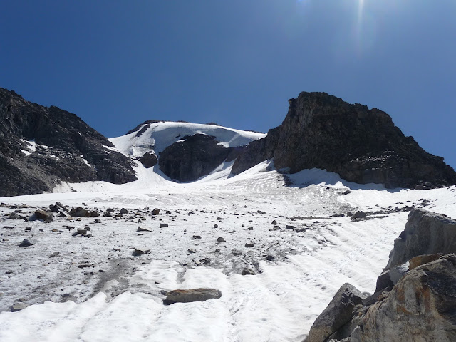 Am Firn oben angekommen, entschied ich mich dafür, dem Felsgrat bis zum Gipfel zu folgen, da der Gletscher schon recht weich und unangenehm steil erschien.