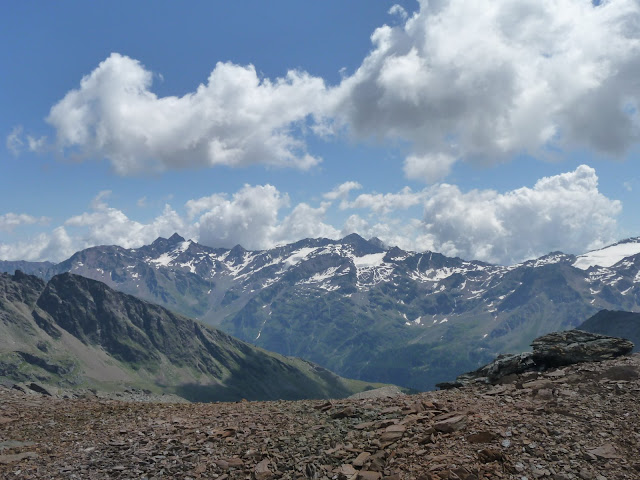 Allzu lange hielten wir uns aber nicht am Gipfel auf, da wir nun ins Rosimjoch (3288m) abstiegen und von dort über Schildspitze (3468m), Plattenspitze (3422m), Innere Pederspitze (3312m) bis zur Hinteren Schöntaufspitze (3324m) stiegen. Diese gesamte Gratüberschreitung belohnt mit einer stets guten Aussicht auf Ortlerdreigestirn, Cevedale, große Teile der Ötztaler Alpen, Silvretta, Berge über der Marteller Hütte, etc. Im Führer mit nicht schwieriger als I angegeben, übertrifft die Überschreitung diesen Schwierigkeitsgrat nur an kurzen Stellen, jedoch ist man, sobald man die direkte (teilw. ausgesetzte) Gratkante verlässt, sofort in äußerst brüchigem, heiklem Blockgelände. Steigspuren sucht man auch meist vergebens, allerdings ist man daher logischerweise meist alleine (das Gipfelbuch der Schildspitze wies nur eine handvoll Einträge auf).