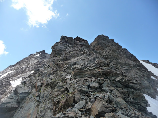 Am nächsten Morgen um 7 Uhr stiegen wir zunächst über den Nordwestgrat auf die Vertainspitze (3545m). Deutlich markiert zum Einstieg und meist direkt der Gratschneide folgend, geht es hinauf, einzelne Stellen erreichen den III.Grat, man kann diese Stellen auch einfacher umgehen, ist dann aber recht schnell in unangenehm brüchigem, absturzgefährdetem Ier- IIer Gelände.