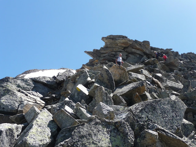 Der sehr schöne Steig leitet nie allzusteil zur Hütte hinauf, wobei man Anhand der Menschenmassen die Ferienzeit bemerken konnte. Nach einer kurzen Rast an der Hütte, ging es über die Reinstadler Route auf den Hohen Angelus (3521m), die ursprüngliche Normalroute über die Angelusscharte wird wegen zunehmender Ausaperung und dem damit verbundenen Steinschlag kaum mehr genutzt.