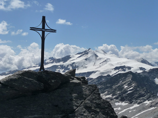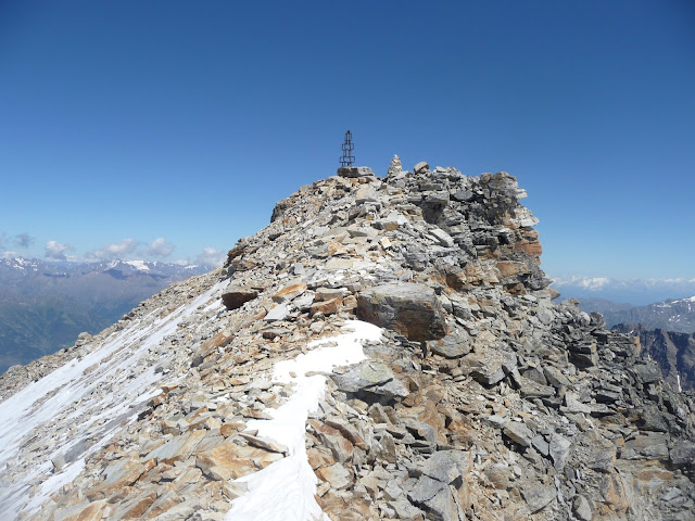 Inclusive eines zeitintensivem Verhauers, erreichten wir den Gipfel nach knappen 3 Stunden. Genau wie am Vortag auch von hier eine gigantische Rundsicht, wobei besonders Erinnerungen an unsere Ortlerbesteigung von 2001 (damals nur in Fleecepulli bei Windstille am Gipfel), wach wurden.
