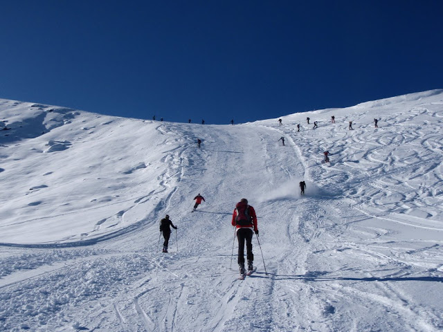 Vennspitze - zuerst hätte ich gedacht ich kann die Schi wieder runtertragen, aber schlussendlich ist es gar nicht so übel gegangen. Achtung, durch den Föhn hats ziemlich geblasen und so wirklich steil sollte man zur Zeit nichts fahren.