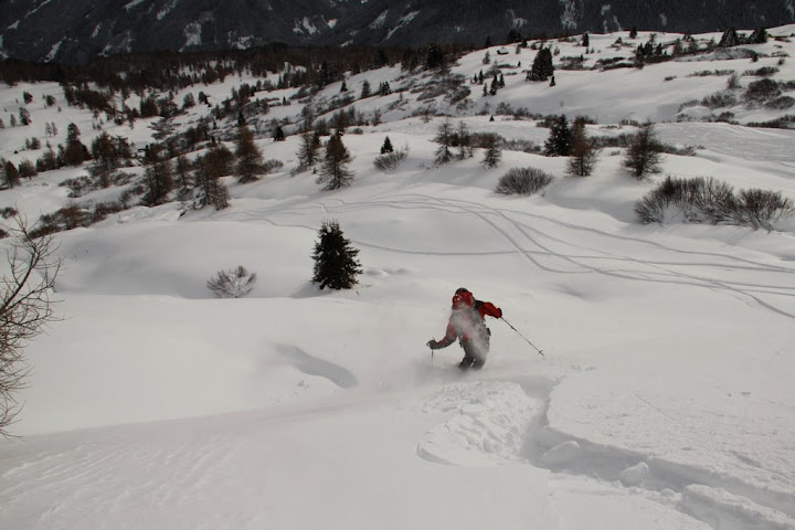Sind heute von Vinaders aus auf den Eggerberg. Start beim (übrigens hervorragenden ) Gasthof und Aufstieg über die Wiesen. Zuerst noch 20-25 cm Pulver ohne Unterlage, dann bald eine dünne Altschneedecke mit ansprechender Pulverauflage. Abgesehen vom Föhnsturm oben ein super Skitag!