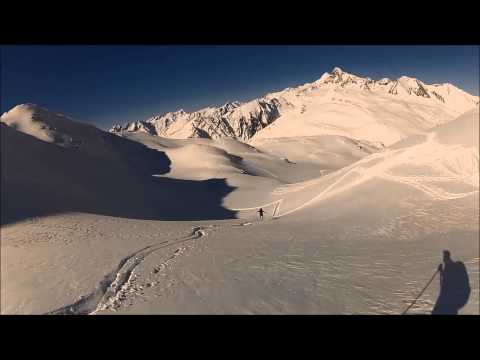Nach etwas mehr als einer Stunde, einer Gipfelschnaps-Runde und etlichen Ausdrücken der Begeisterung, fahren wir schließlich über den Südhang ab, der zwar schon völlig zerfahren ist, aber dennoch mit großartigen Schneeverhältnissen aufwarten kann.