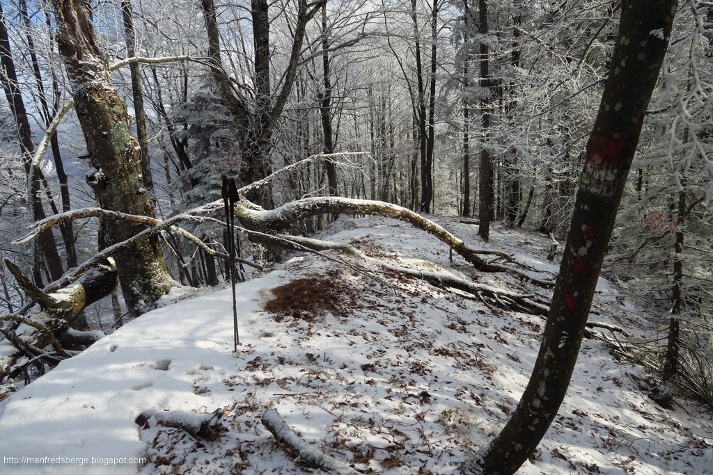 Charakteristik der Tour: Es gibt etliche Trittspuren, die aber auch von Tieren herrühren könnten. Im Mittelteil finden sich auch mal blaue Markierungen an Bäumen und Steinen. Oben am Kamm auch mal rot-weiße Markierungen. Sonst eher eine weglose Kurztour, teils auch mal steiler im Wald. Vorm Gipfel gibt es eine Aufforstungsfläche, da gibt es Einiges an Aussicht z.B. aufs Sengsengebirge