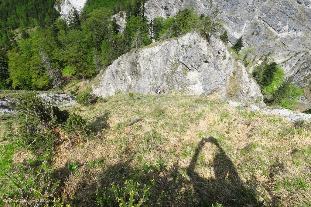 Charakteristik der Tour: Unmarkierte sehr steile weglose Tour meist im Absturzgelände. Je nachdem wie man es erwischt bewegt man sich meist im 1er Gelände. Nur bei trockenen Bedingungen zu begehen. Eine Stelle ist mit einem rostigen Stahlseil entschärft, eine weitere mit einem langen elastischem Stoffseil, welches besonders im Abstieg sehr hilfreich ist. Die Tour ist nur für erfahrene Bergsteiger, die sich im steilen Gelände sicher bewegen können, zu empfehlen!