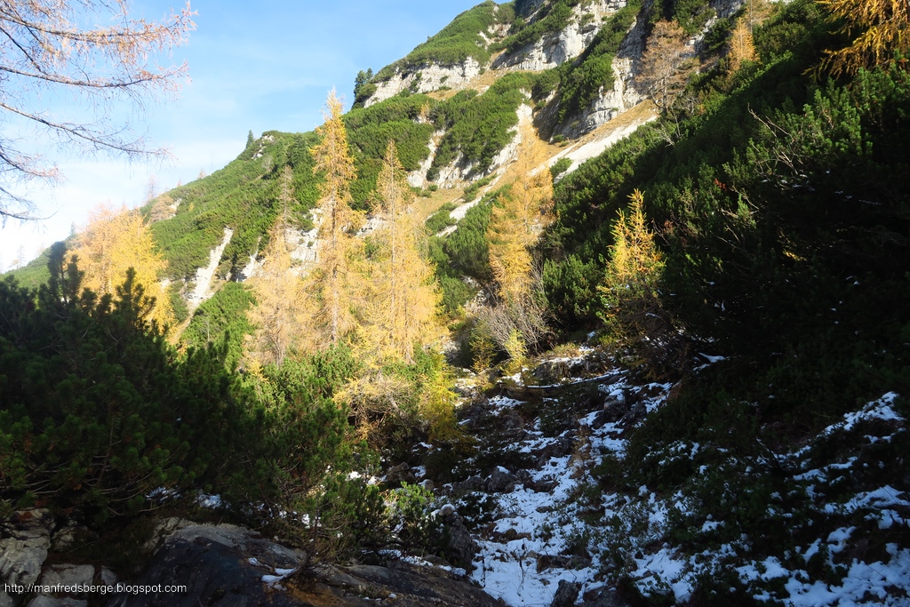 Ich steige den Wanderweg zu hoch rauf und bin schon bei der Latschengrenze. Das ist zu weit, also wieder ein Stück retour und rüberqueren. Den richtigen Einstieg zum Steig zur Oberen Schönbergalm hab ich nicht gefunden: