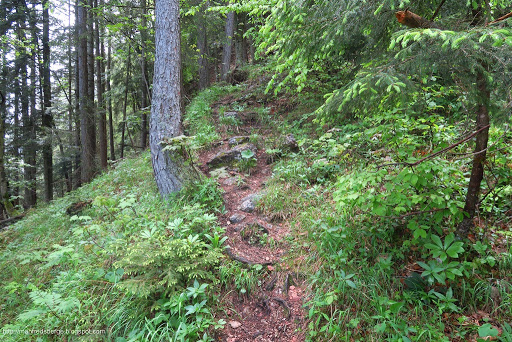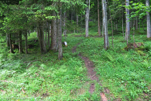 Hier geht ein gatschiger Steig rein. Auf dem Schild vorne steht, dass der Steig wegen Windwürfen und Felssturzgefahr nicht begehbar ist. Wie lange das Schild schon steht, weiß ich nicht und verboten ist es auch nicht, also gehe ich weiter: